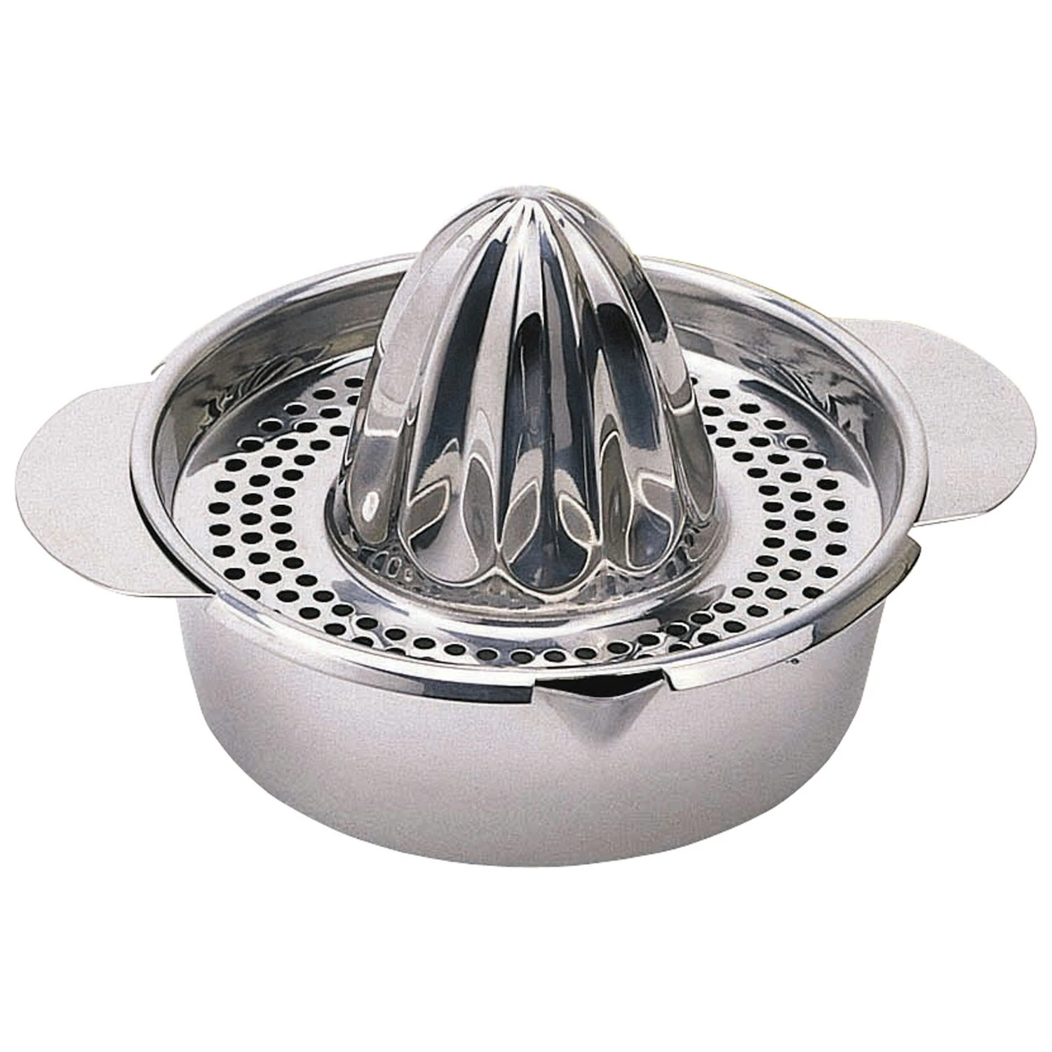 Zweiteilige Zitruspresse von Kitchen Craft in rostfreiem Design, die dank des perforierten Einsatzes Fruchtfleisch und Kerne vom Saft trennt. Ausgestattet mit Griffen und Ausguss, um direkt nach dem Auspressen den Saft ausschenken zu können.