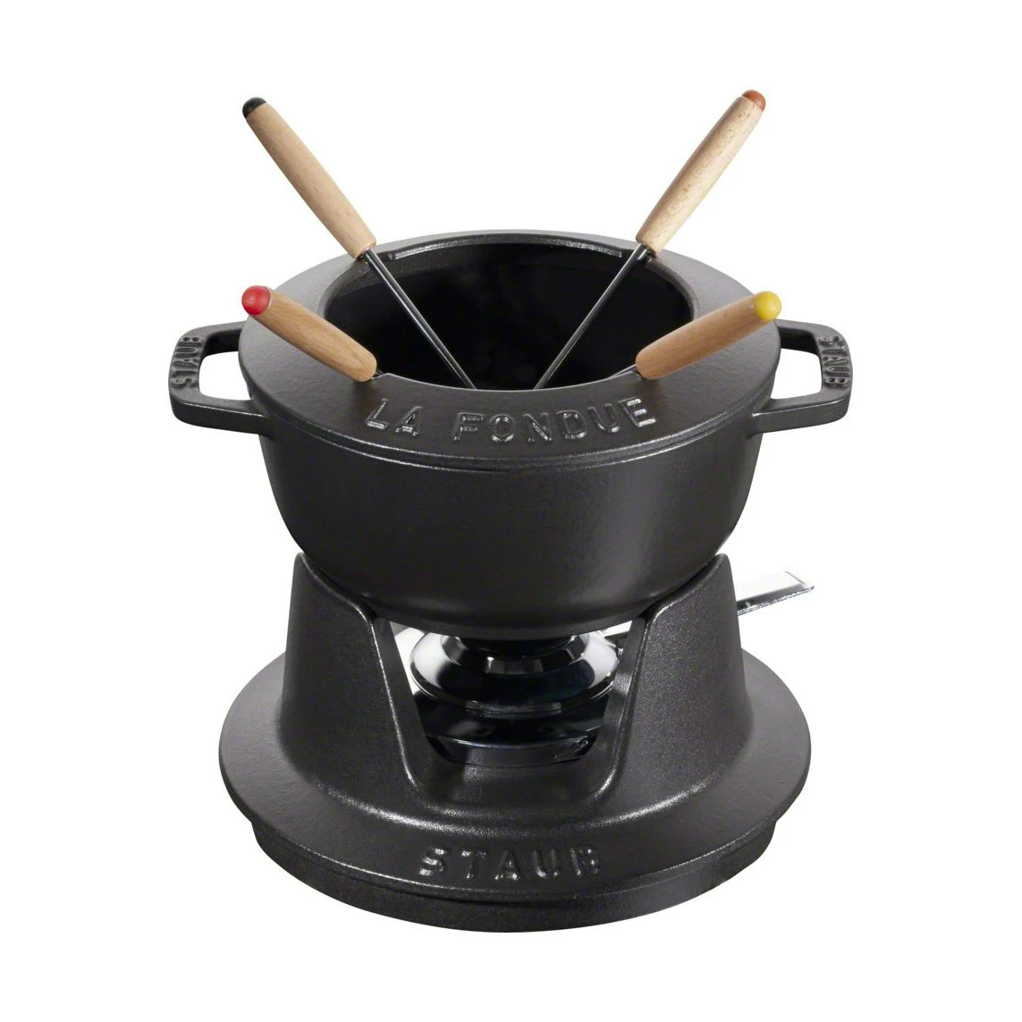 This compact fondue set has ergonomic handles and can store the heat carrier in the pot. The set includes fondue forks, burner and burn pasta.